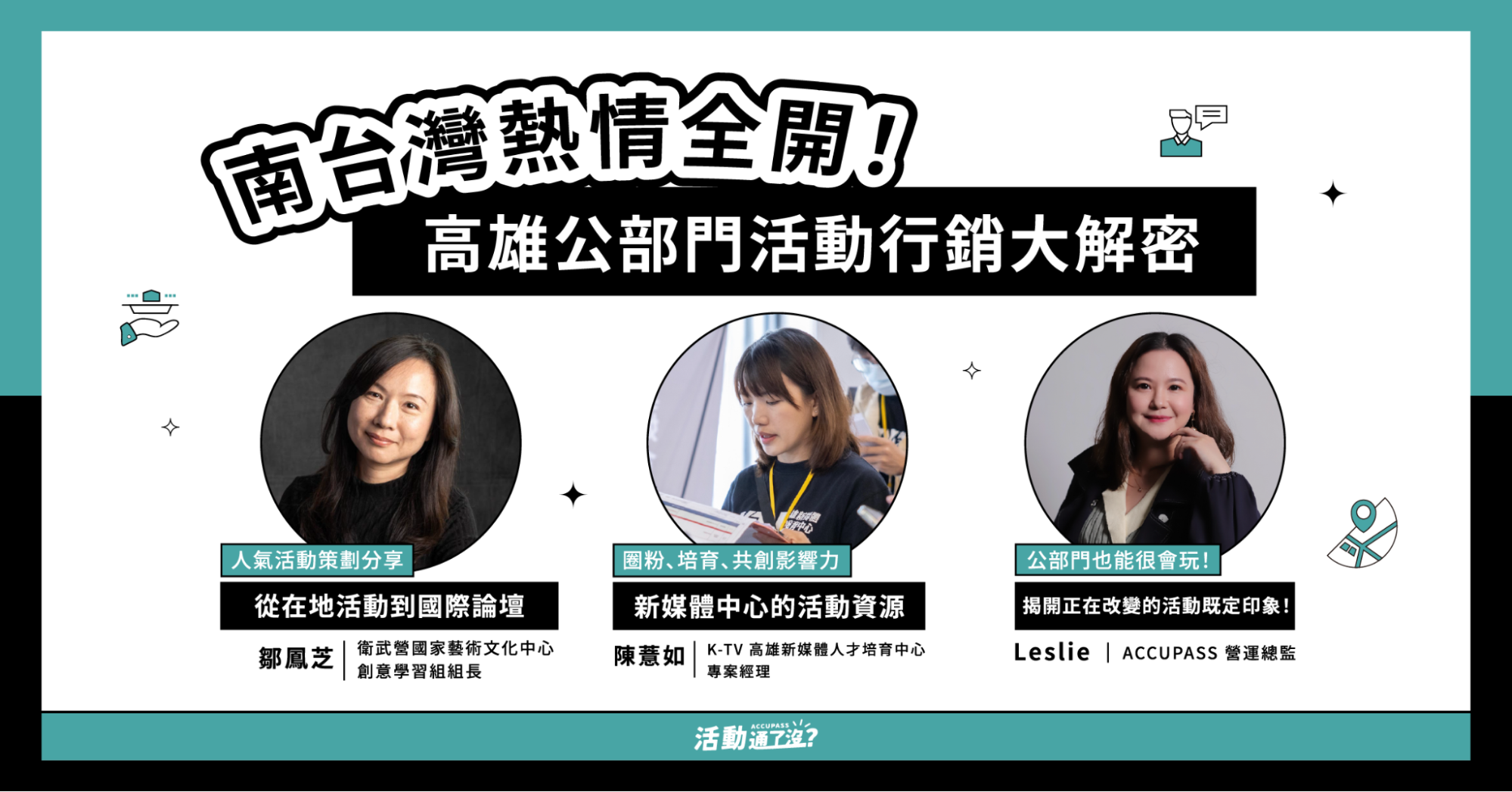 你以為公部門的活動都很制式、傳統嗎?事實上,從人才培育到藝術推廣,南台灣的政府單位早已用創意與策略顛覆你的想像!在 ACCUPASS 主辦的《活動通了沒》系列聚會中,兩位重量級嘉賓揭開公部門活動行銷的祕密:衛武營國家藝術文化中心學習推廣部創意學習組組長 鄒鳳芝 與 K-TV 高雄新媒體人才培育中心專案經理 陳薏如,他們以豐富的實戰經驗,帶來從企劃思維到宣傳策略的全面洞察,讓大家看見政府活動的另一種精彩!